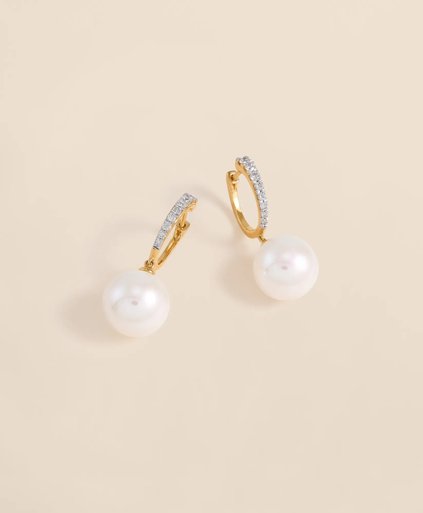 These drop earrings feature luminous 11 12mm Ming pearls suspended beneath diamond-accented hoops. Elegant and event-ready, they're crafted in 14k yellow gold with push-back closures. Pair with our pearl necklace and bracelet for coordinated style.