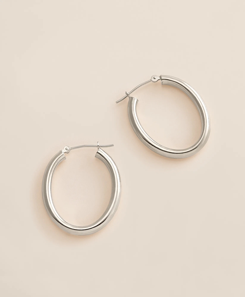 Clean, classic, and endlessly versatile, these 25mm oval hoops are crafted in polished 14k white gold. Designed with a hinged catch closure and lightweight feel, they offer a minimalist finish that works from day to evening.