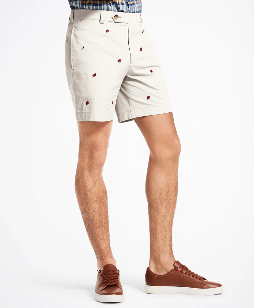 You will be the talk of summer BBQ in these cotton poplin shorts with a fun whimsical ladybug embroidery motif. Tab front waistband with coin pocket. Contrast interior waistband and piping. 7 inseam.