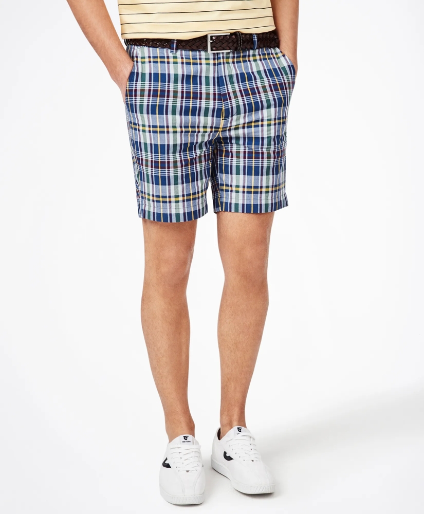 Pure cotton madras, authentically woven in India. Tab front waistband. Contrast interior waistband in chambray. 7" inseam. Machine wash according to care instructions for best results. Imported.