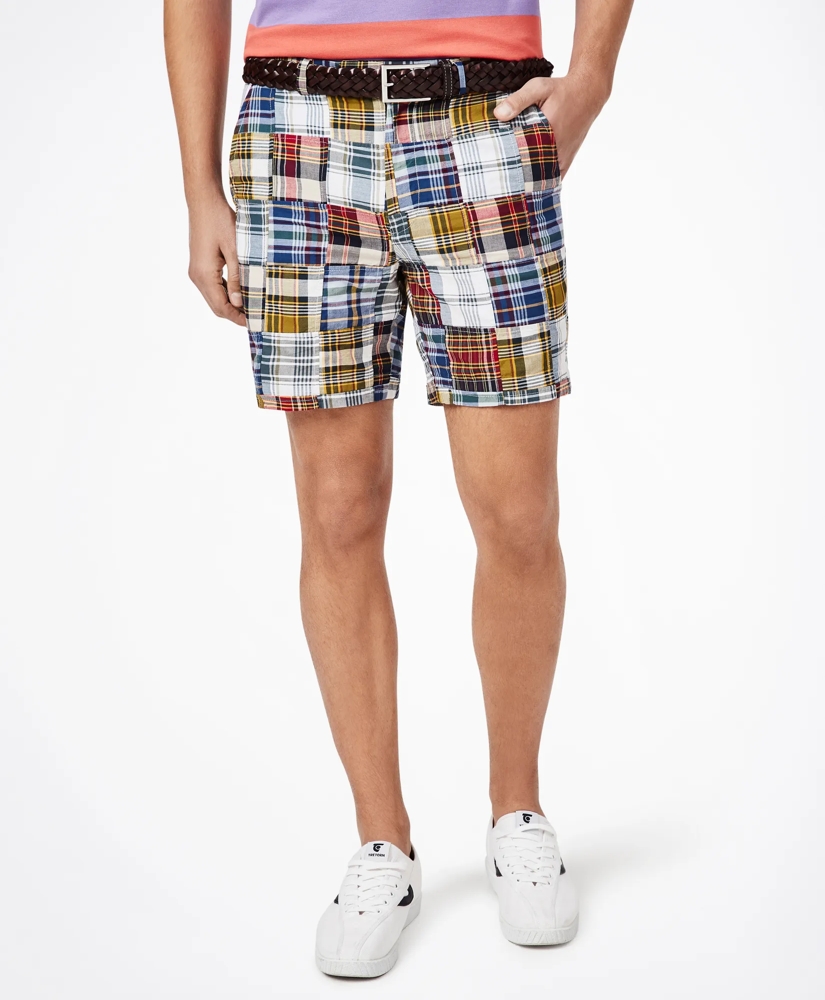 Pure cotton madras, authentically woven in India and crafted into a patchwork fabric short. Tab front waistband. Contrast interior waistband. Lightly washed for a soft hand. 7" inseam. Machine wash according to care instructions for best results. Imported.