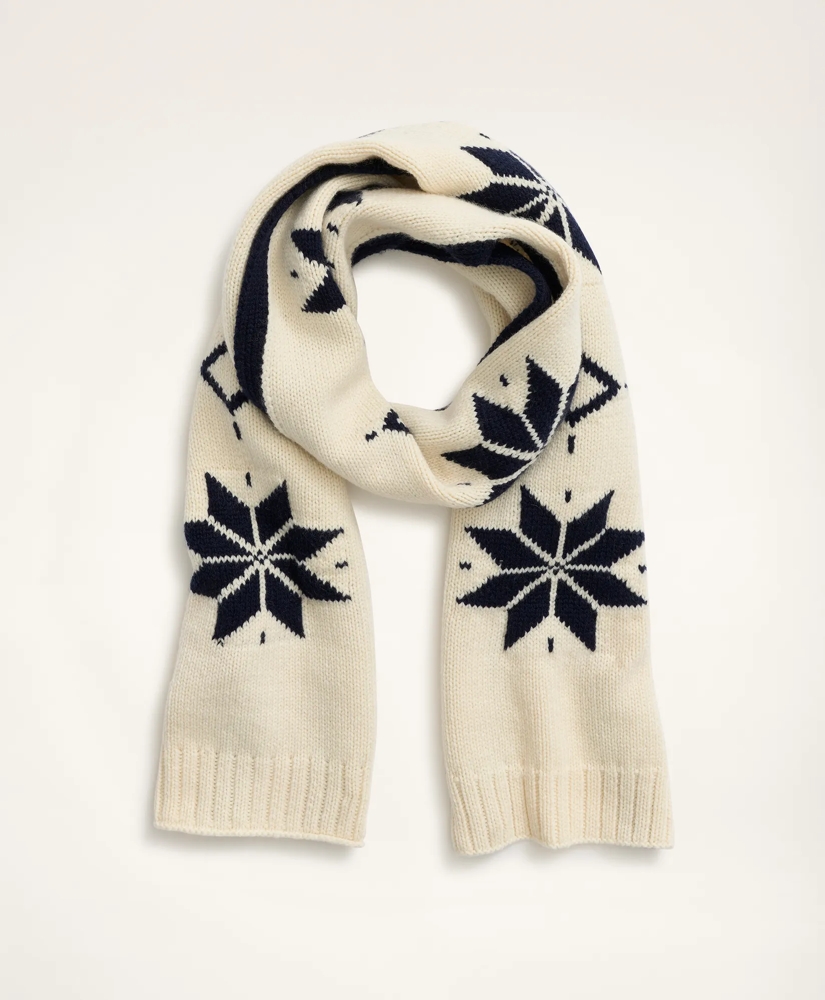 A beautiful intarsia snowflake pattern is on display in our luxuriously soft scarf made from a warm wool-cashmere blend.