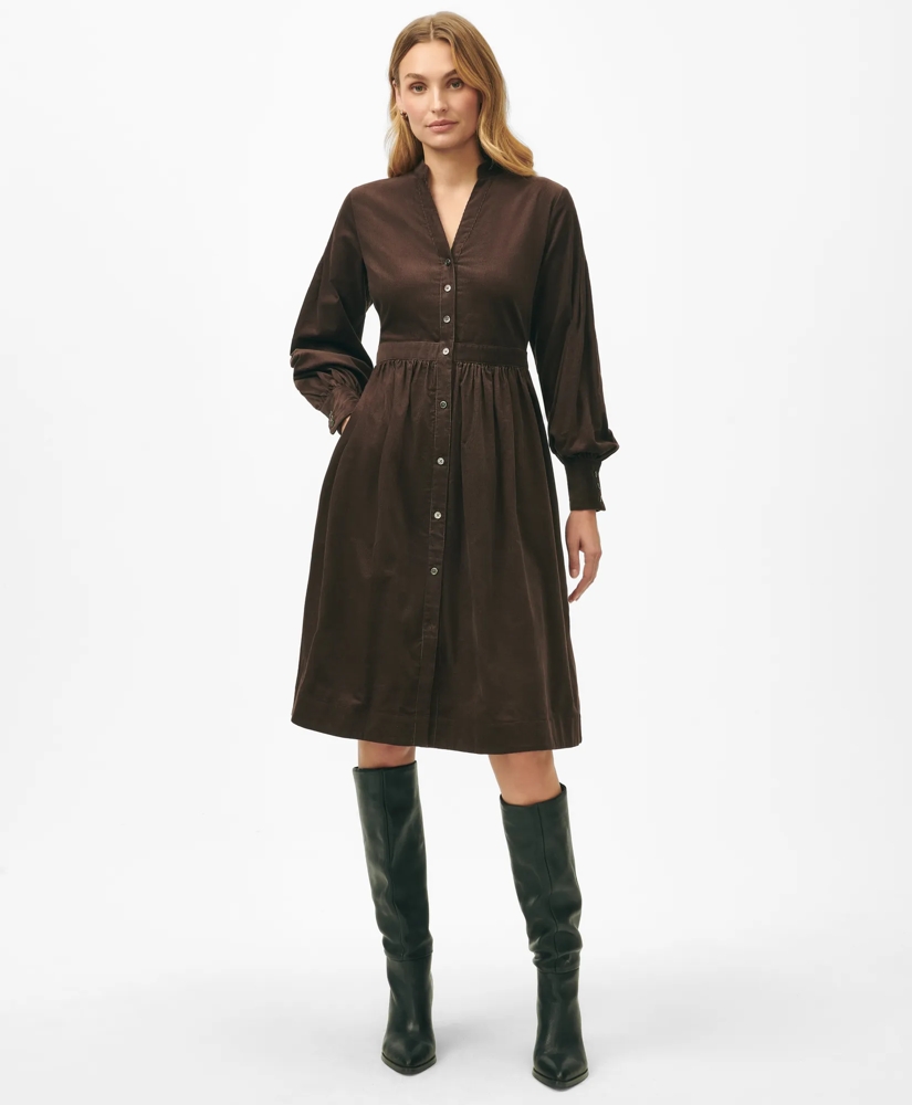 Fall-favorite corduroy gets a chic update in our shirt dress. With a banded collar, pleated sleeve detail, and concealed on-seam pockets, it's the ideal mix of form and function. We finished the look with front-button closure and an ultra-flattering fit-and-flare silhouette for a hero piece you'll love all season.