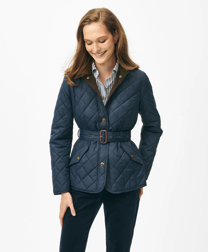 Classic utilitarian inspiration pairs with a flattering belted waist in our quilted jacket that goes from town to country. Chic emblem-embossed buttons, a diamond-quilted pattern and plaid lining finish the piece with a nod to heritage style and high-quality craftsmanship.