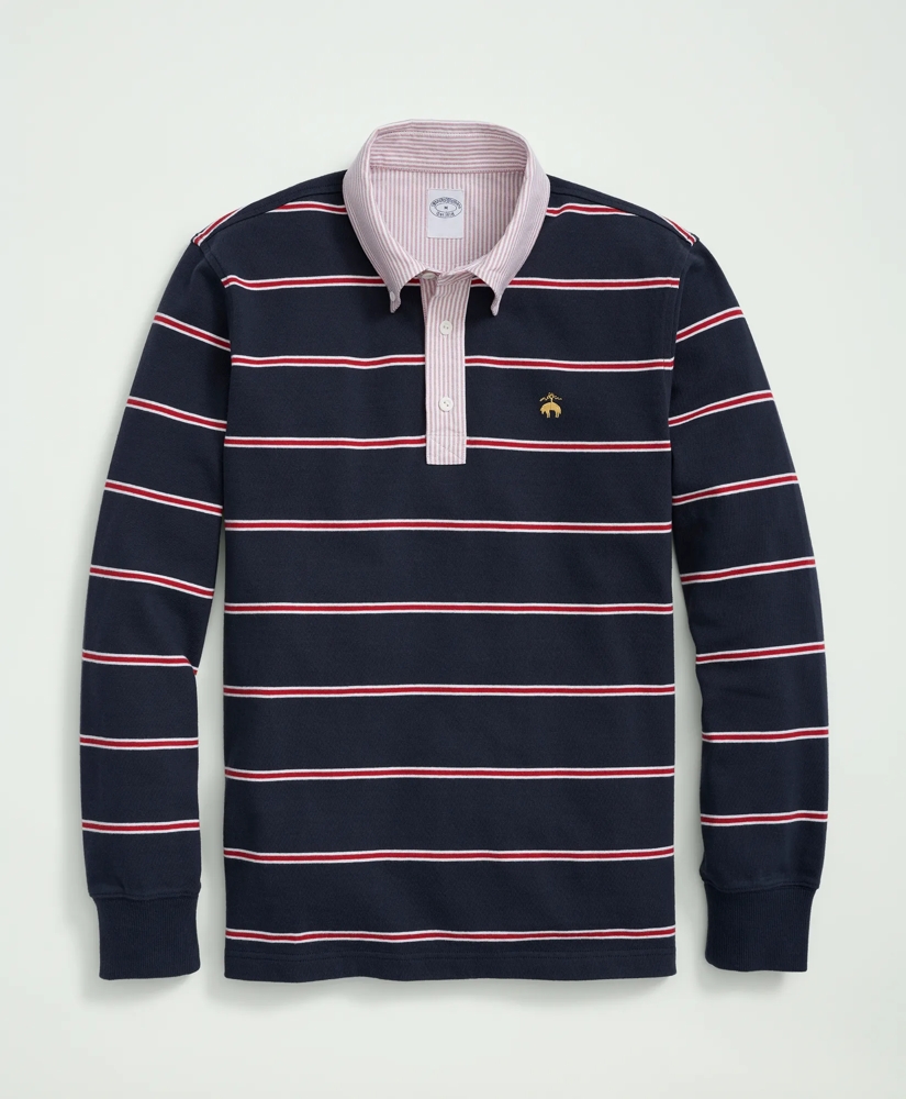 Our authentic rugby shirts are legendary. Made with classic woven collars, featuring rubber buttons and substantial cotton that just gets better over time, we play to win your style, and comfort, game. This rugby boasts our signature BB#2 rep stripe. Inspired by Great Britain's regimental ties from WWI, we reversed the original direction of the stripes, for an American twist that nods to democratizing style.>