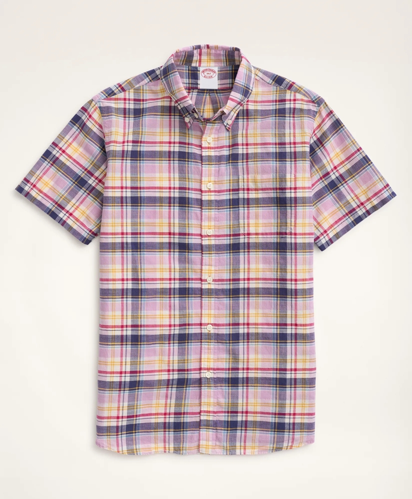 The quintessential summer fabric originated in the Indian city of Madras now called Chennai , and has been a Brooks Brothers tradition since we were one of the first to bring the brightly colored plaids to the U.S., nearly a century ago. Now, we've updated our madras with a washed finish that feels and looks lived-in from the very first wear. Additional featyre includes a left chest pocket.