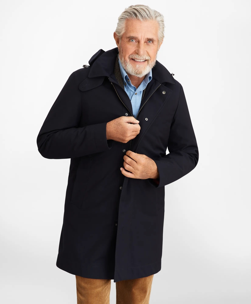 Take on the rain in this seam-sealed topcoat, made with specially constructed fabric woven in Italy for a sturdier feel. Features include a center-front zipper with snap storm flap closure, removable hood, two side entry exterior pockets, two interior pockets and a center-back vent. Filled with warm Thermore® Ecodown® for warmth and comfort that lasts.