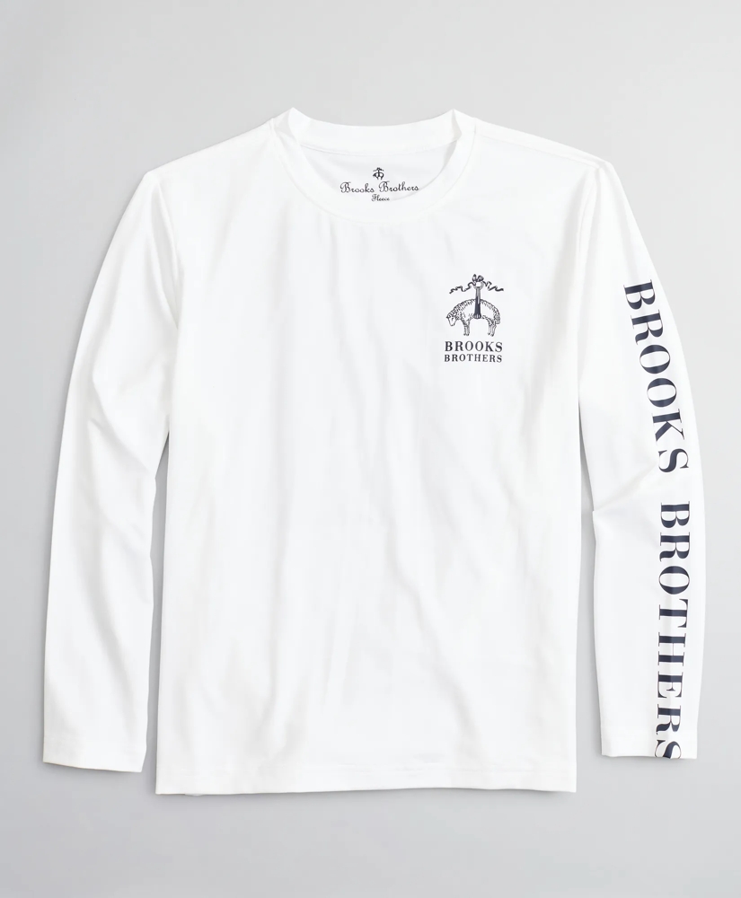 Moisture wicking performance long-sleeve t-shirt in stretch jersey with heat transfer logos on left arm, chest and back. Machine wash. Imported.