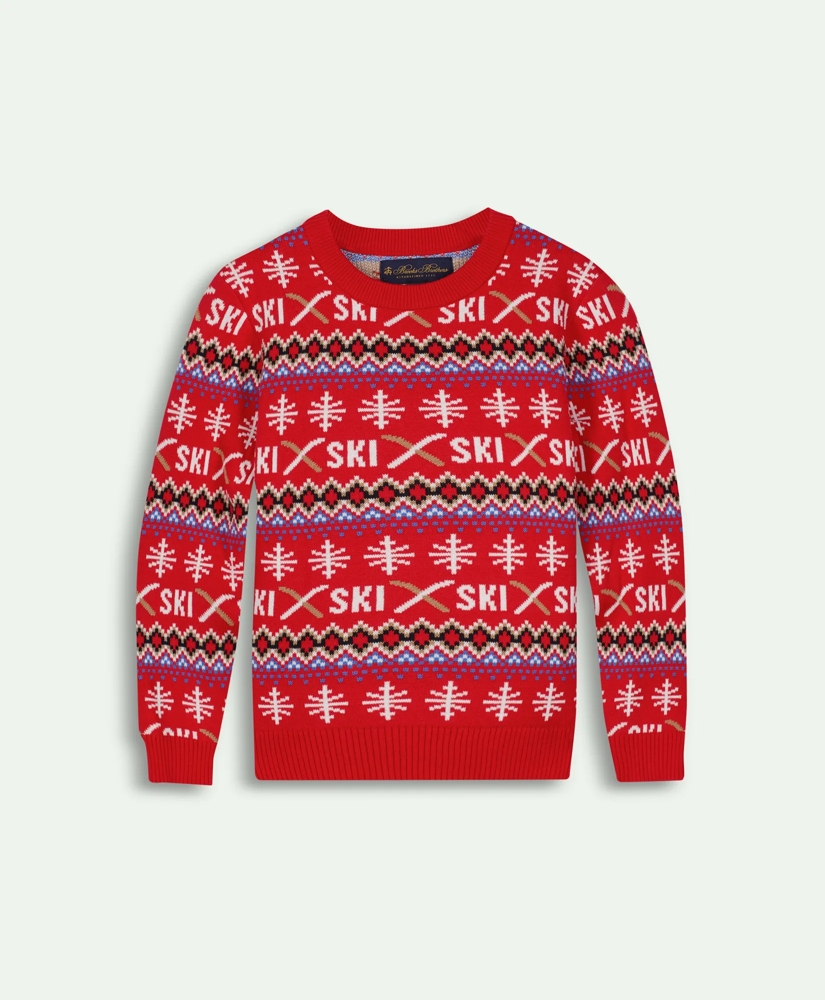 Apres ski-inspired fair isle crewneck sweater with logo tab label at side seam.