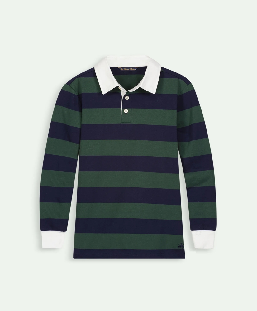 Long sleeve rugby shirt in a lightweight jersey fabric with wide stripes and logo embroidery on the chest.