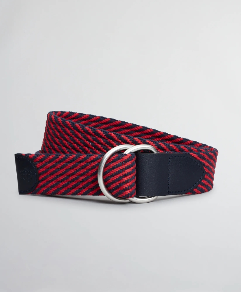 Cotton web stripe belt with navy leather tips and a D-ring closure. Imported.