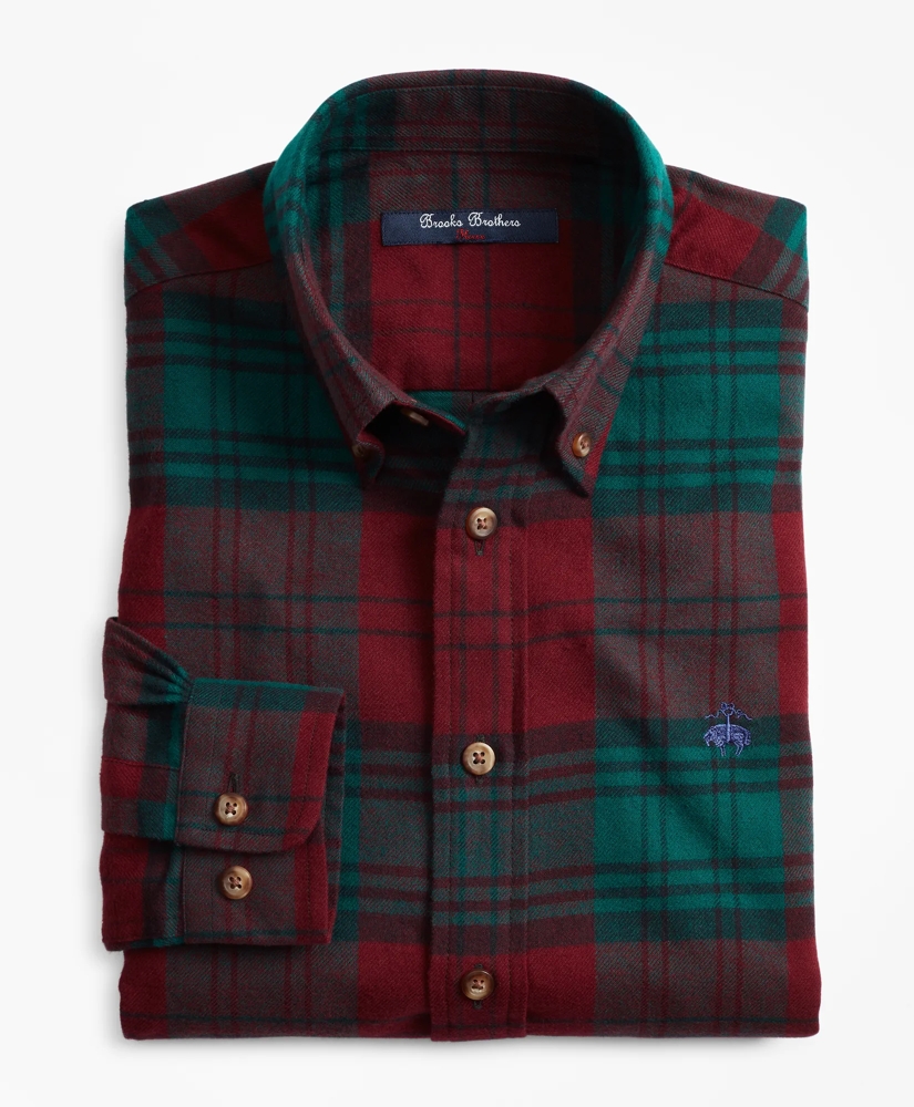 Our flannel sport shirt is crafted in cotton with a button-down collar and our signature 6-Pleat Shirring® at the barrel cuffs. Large holiday plaid pattern and our fleece embroidery at wearer's chest . Machine wash. Imported.