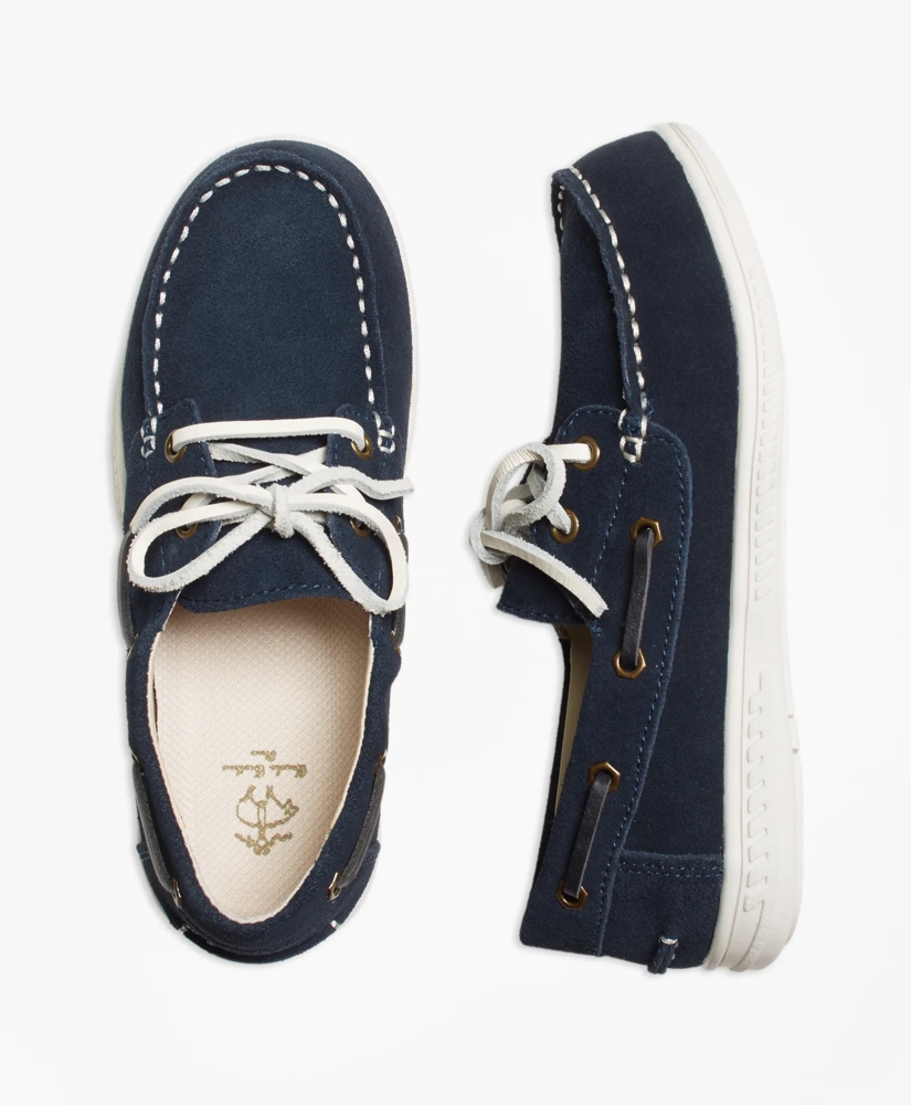 This shoe is a classic suede boat shoe with white leather laces and rubber sole. Imported.