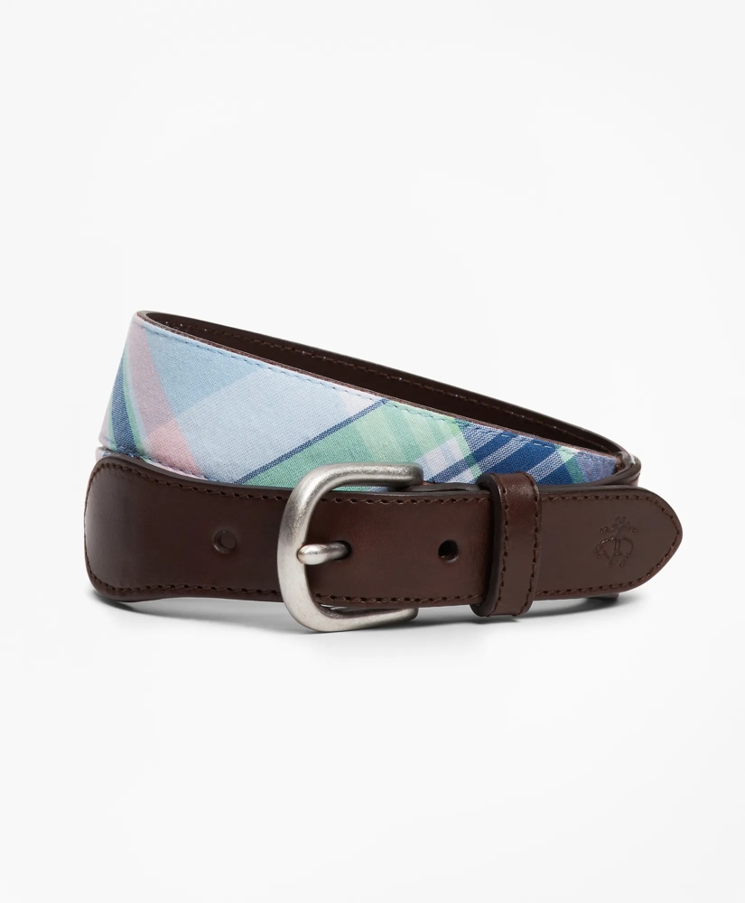 Made from a classic madras print with faux leather front and interior. Metal buckle with three holes for adjustment. Embossed Golden Fleece® logo on end. 1 ¼" wide" Imported.