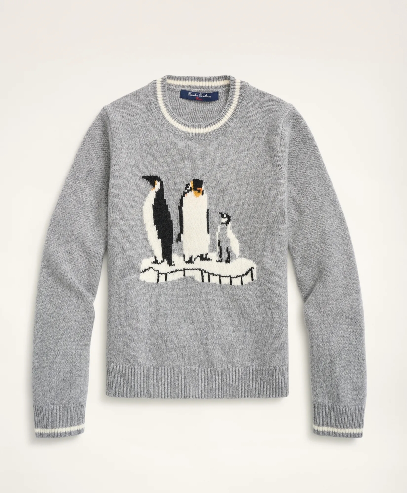 This merino blend crewneck sweater features a knit intarsia group of three penguins relaxing on an iceberg and is perfect for school days or weekends. Contrast tipping at the ribbed neck, cuffs and hem finish this look.