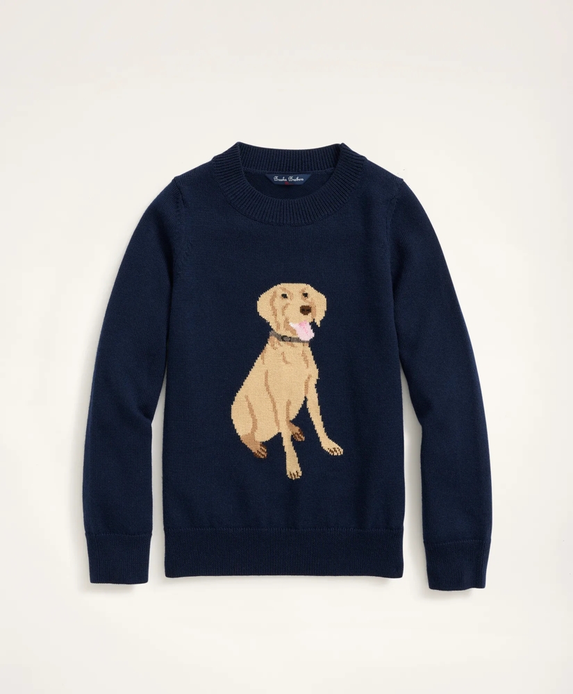 Merino wool crewneck sweater, with knit intarsia dog at front body. Rib knit trim at neckline, sleeve cuffs and hem.