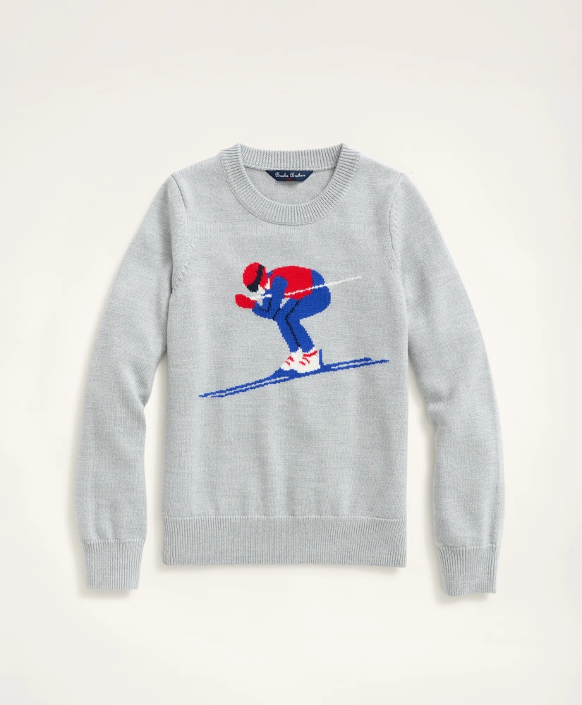Merino wool crewneck sweater, with knit intarsia skier at front body. Rib knit trim at neckline, sleeve cuffs and hem.