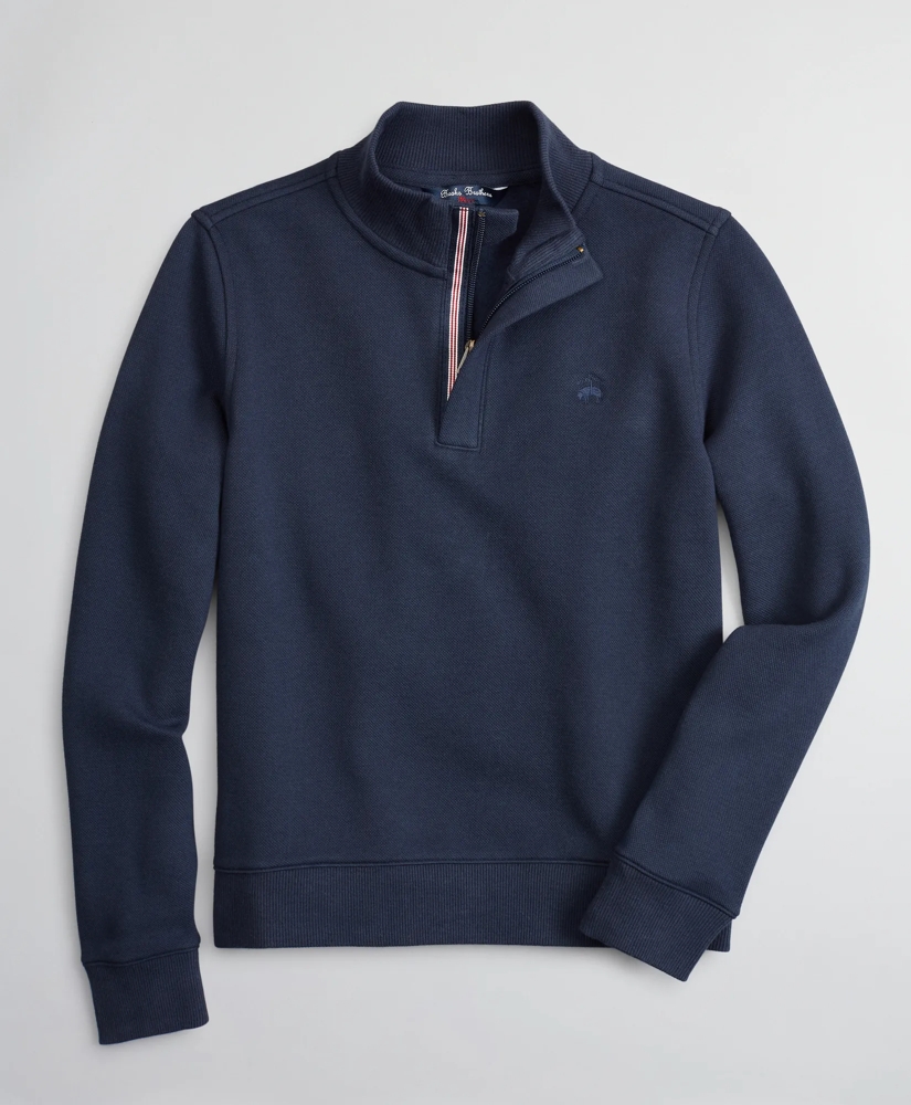 The classic half-zip with a twist, polyester and cotton with a grooved pique knit and warm fleece interior and our signature BB#1 stripe along the zipper on a grosgrain ribbon. Tonal logo at the chest and rib-knit collar, cuffs and hem. Machine wash. Imported,