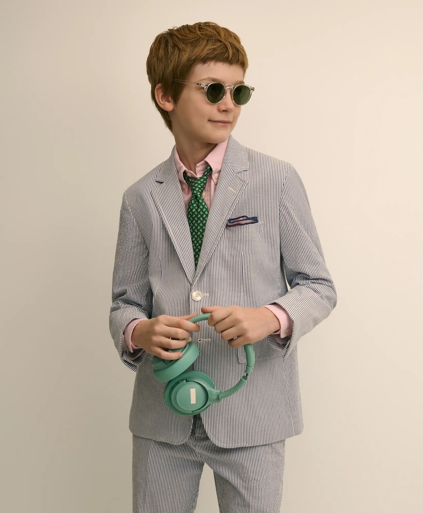 Our signature seersucker jacket, in the fabric Brooks Brothers popularized in the early 20th century, is a must-have for classic summer style. We added stretch to keep him comfortable. Pair with our matching pants for a full look.