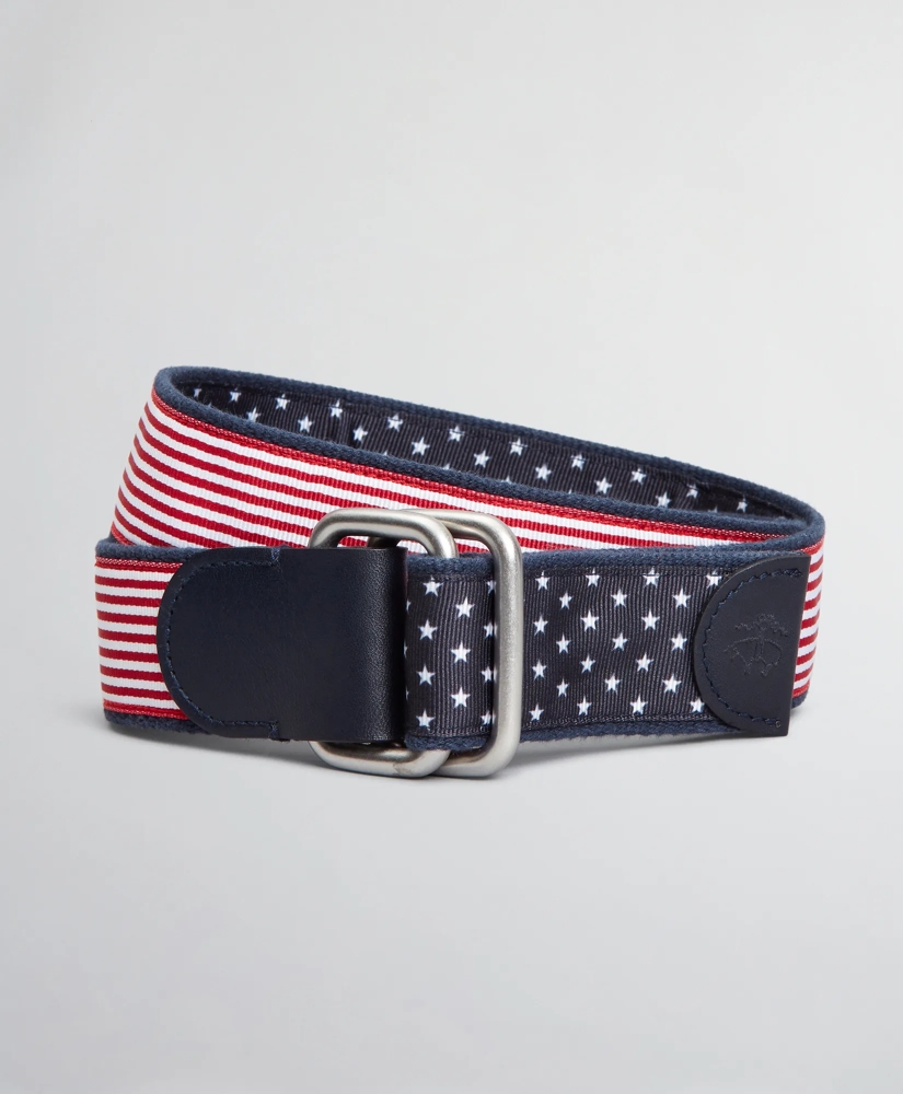 Reversible stars and stripes motif belt. D-ring closure and leather end tabs. Imported.