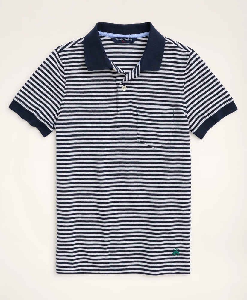 Whether they're laying this piece or wearing it alone, this alternating stripe polo is perfect either way in pure cotton pique with our performance finish. Each shirt is finished to maintain its shape while resisting shrinkage, fading and pilling. Tonal ribbing at contrast collar and sleeve cuffs and a 2 button-front placket.