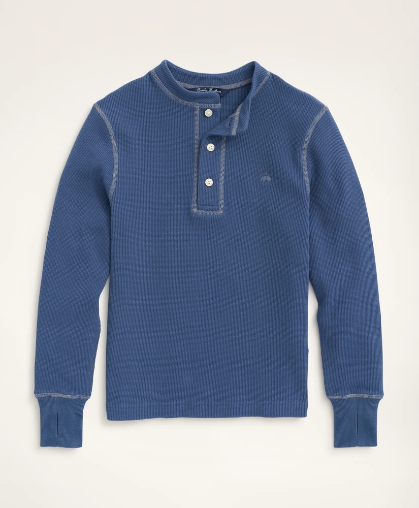 A wardrobe essential, our long-sleeved henley features a textured waffle pattern, signature fleece logo, pearl buttons and the perfect weight for layering or wearing on its own.