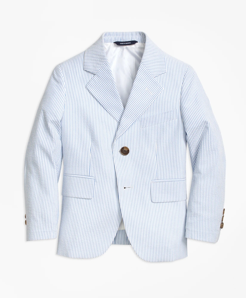 Our classic two-button suit jacket is crafted in a breathable cotton seersucker and features two flap pockets and a welt pocket at chest. Center vent at back. Fully lined. Dry clean. Imported.