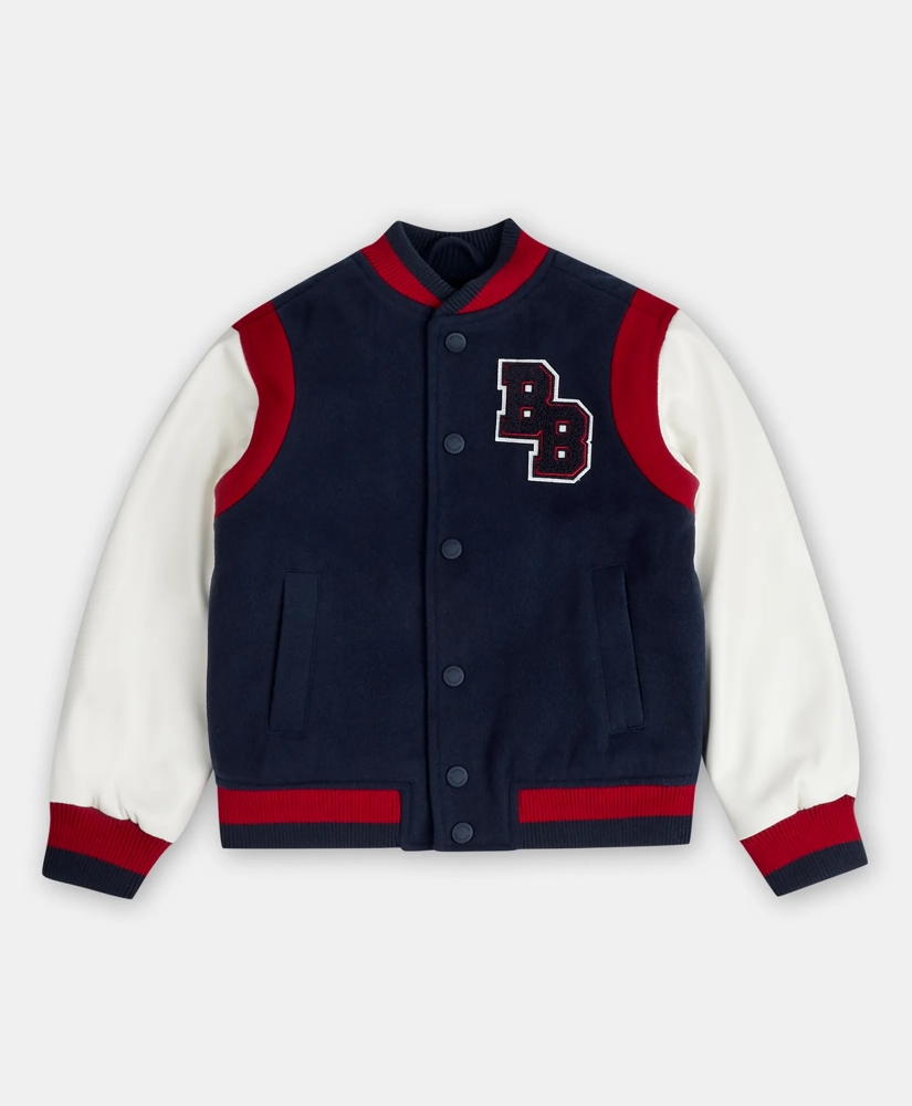 Prep your guy for campus style with our adorable varsity jacket that looks just like the grown-up version. Snap-button front closure, contrast faux-leather details and a BB chest patch make this a must-have for fall.