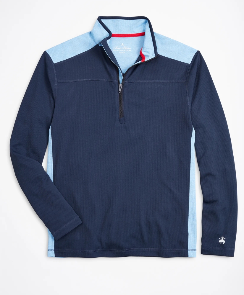 Our Brooks Brothers Stretch Performance Series half-zip is designed for optimal comfort whether out on the course or relaxing at the clubhouse. Crafted from lightweight knitted polyester. Color block details at shoulders, inside neck, and side seam. Brooks Brothers at left chest and metallic heat transfer logo at left sleeve cuff. Cover lock stitches for a durable finish. Machine wash. Imported.