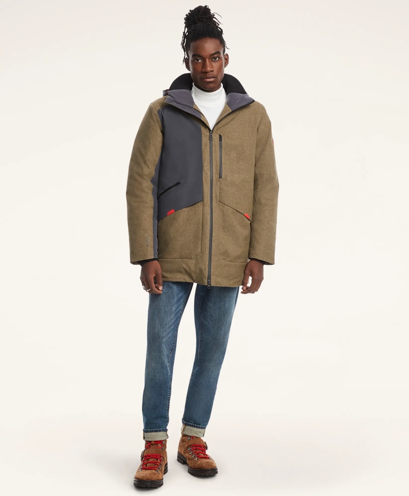 The Solid Parka's GORE-TEX Infinium construction blocks wind and moisture, with a wool-like exterior finish that exudes timeless style. And the bonded hood brim adds another layer of protection. Adjustable hood with bungee front and a buckle volume adjustment on the back. Soft rib knit collar and wrist cuffs. Waterproof 2-way YKK Aquaguard center front and pocket zippers. Interior draft flap and tricot zipper guard at chin. Hand pockets under bonded flaps, with hook-and-loop closure; internal drop in pocket on right side. Rubber diamond patch at left shoulder featuring Spyder x Brooks Brothers Collab logo. Center back length for a medium jacket is 33"