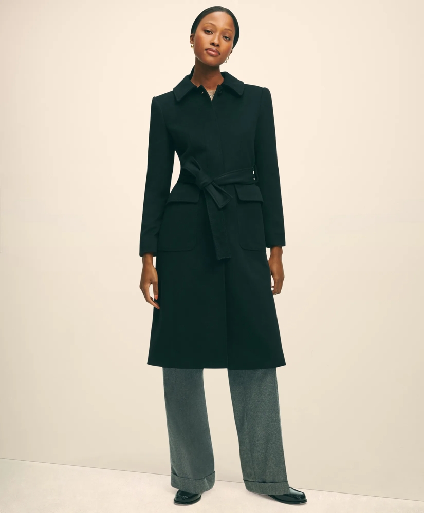 Minimalist sophistication gets a luxurious upgrade with this streamlined wrap coat crafted from rich wool twill woven by Italy's famed Loro Piana® mills. This elegant design features a water-repellent finish, a point collar, genuine horn buttons at the concealed placket, belt loops, a waist-defining self-tie belt, flap patch pockets and tonal pick stitching.