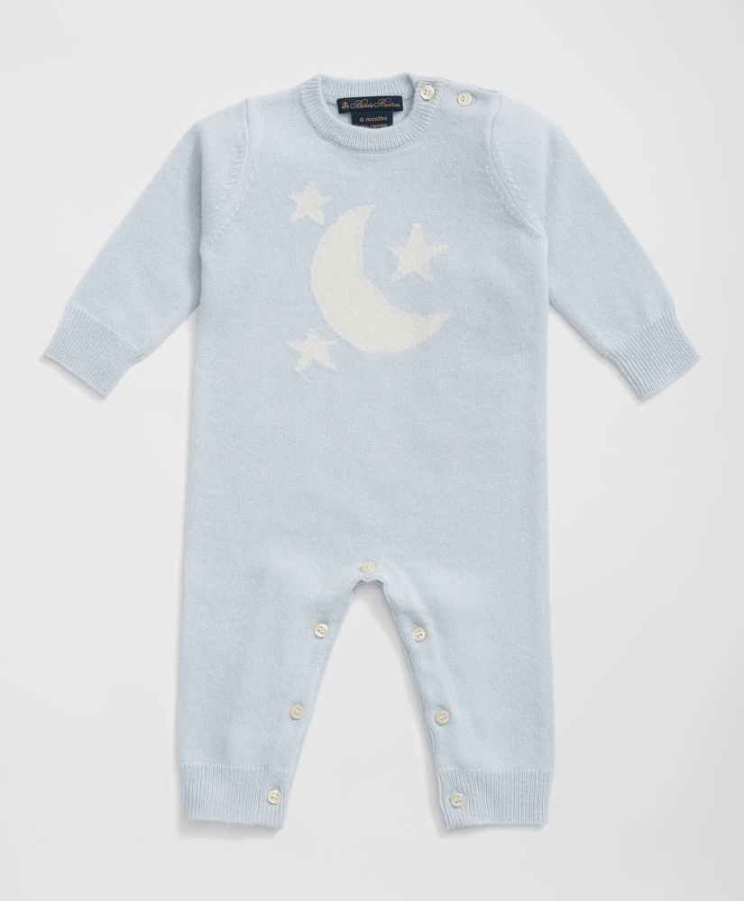 A beautiful baby gift, our knit long-sleeve onesie is crafted from 100% 4-ply Mongolian cashmere for luxurious coziness. A sweet intarsia moon motif adorns the piece. Your set arrives in a lovely Brooks Brothers gift box, a marker of timeless quality and design.