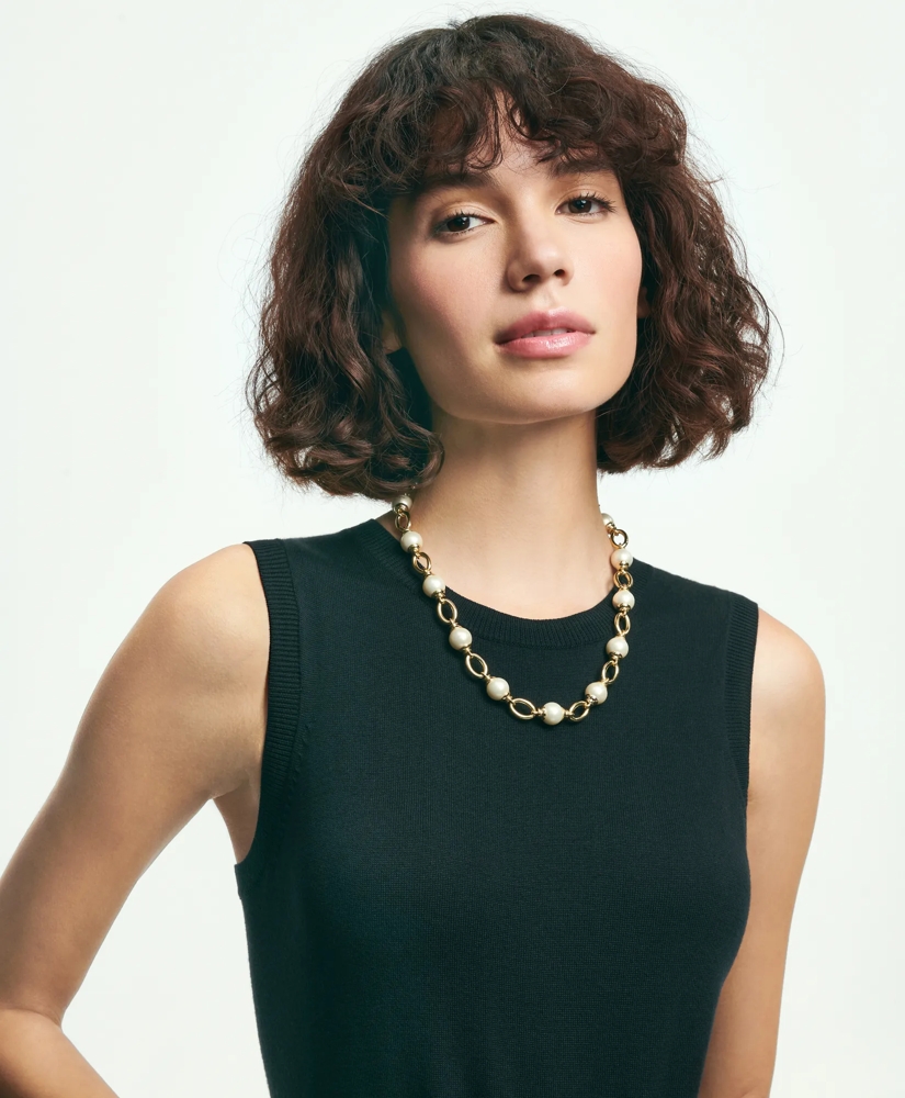 Bold chain detail punctuated with lustrous pearls offers the perfect first-impression necklace.