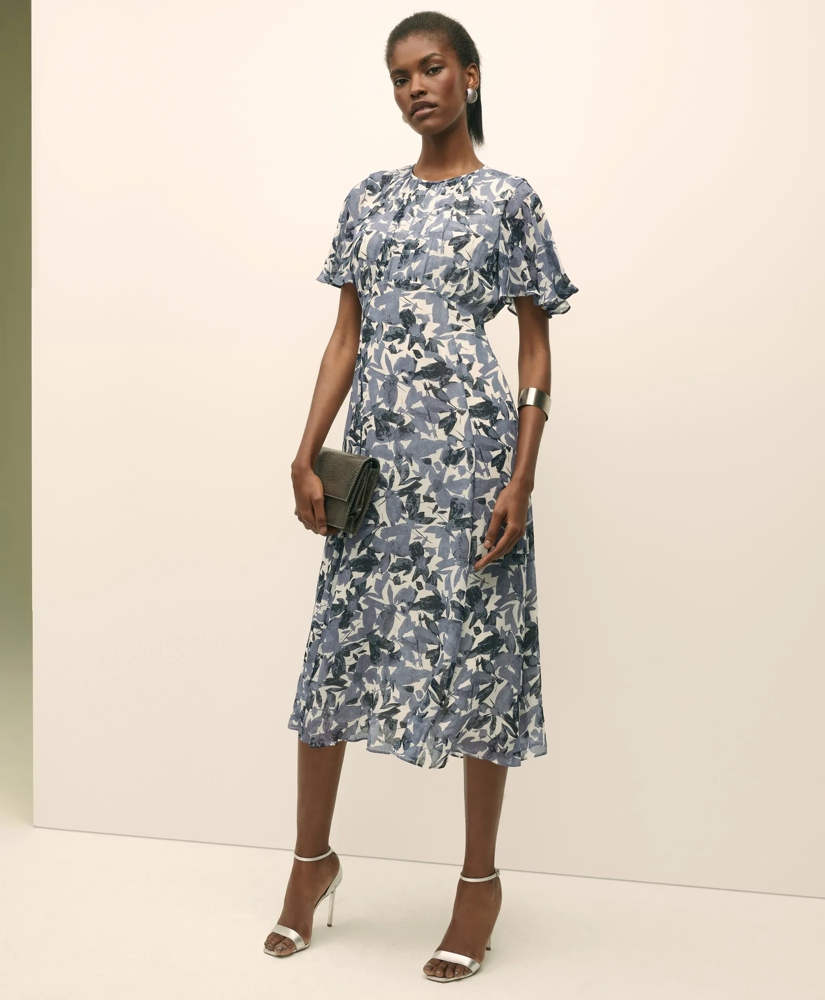 We added flutter sleeves to this gorgeous print and flowing chiffon silhouette. The whimsical finish means an ideal occasion look dressed up with heels or worn on a beachy getaway with sandals.