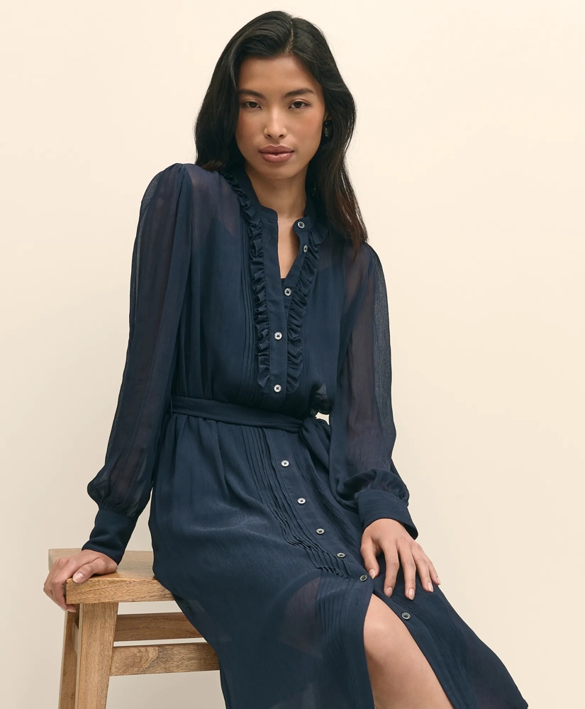 Airy chiffon, a ruffle placket and blouson sleeves make this dress a go-to from desk to dinner and beyond. We love the three-season layering and styling options that make this a wardrobe staple.