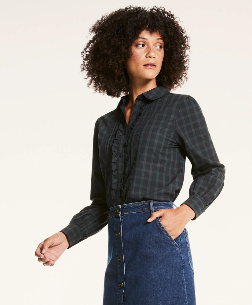 Traditional Black Watch tartan with feminine details references timeless preppy style. A Peter Pan collar and ruffle placket offer texture perfect for fall.