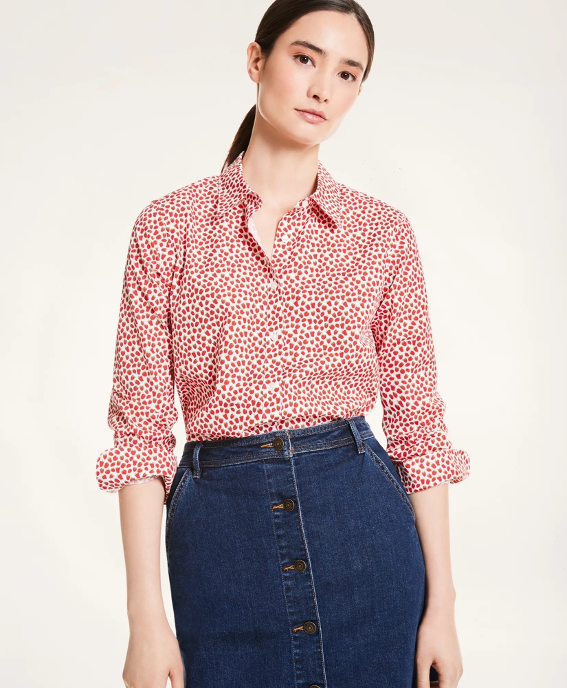 Crafted at the renowned Thomas Mason® mill in Italy, pure cotton is adorned with mother-of-pearl buttons and a signature strawberry print.