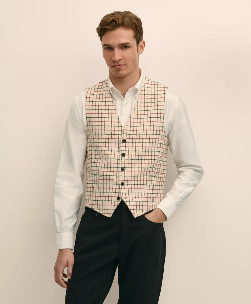 The ultimate third piece for gentlemanly style, our suit vest is crafted from 100% wool woven by the United Kingdom's renowned Abraham Moon & Sons mill. It features classic 5-button closure, welt pockets and a full lining. The natty tattersall pattern finishes it to stylish perfection.
