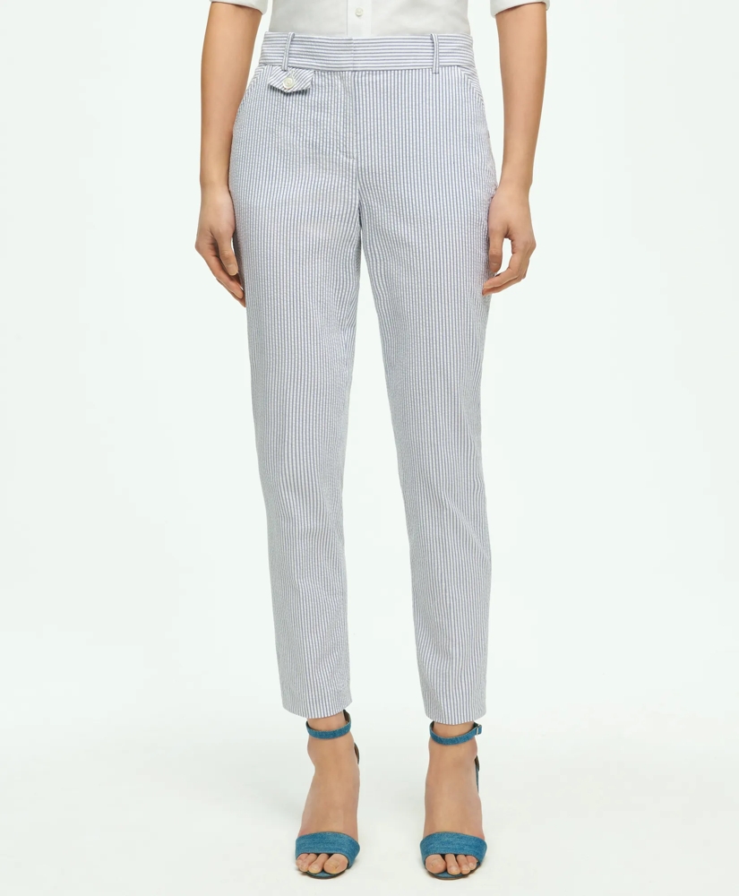 We've updated a chic pair of pants in our signature seersucker, and they work as well with sneakers as they do with dressy sandals and heels. We finished them with a hint of stretch, a hook and bar for closure on the waistband and functional coin pocket with a mother-of-pearl button for closure. Finish the look with our matching jacket. Pants are unlined.