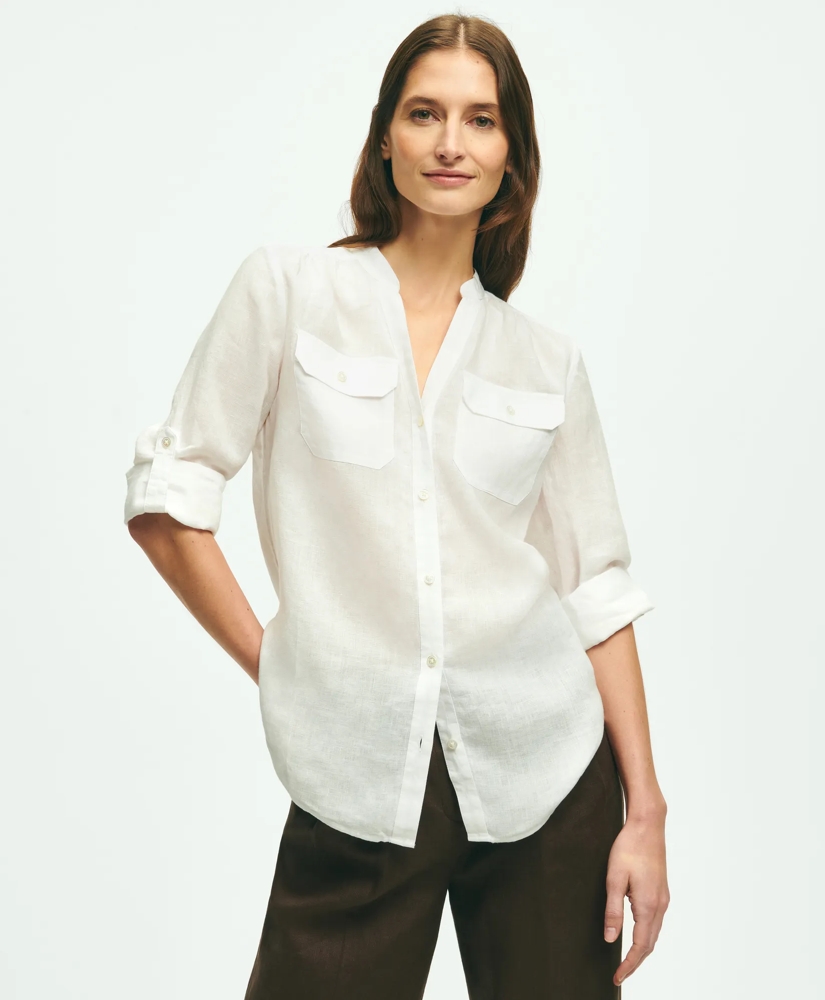 Utility shirts have a timeless appeal, and deserve a place in every wardrobe. Woven for us by the renowned Baird McNutt mill in Ireland, maker of the world's finest linen since 1912, this one features an updated open V-neck, genuine shell buttons and roll-tab sleeves.