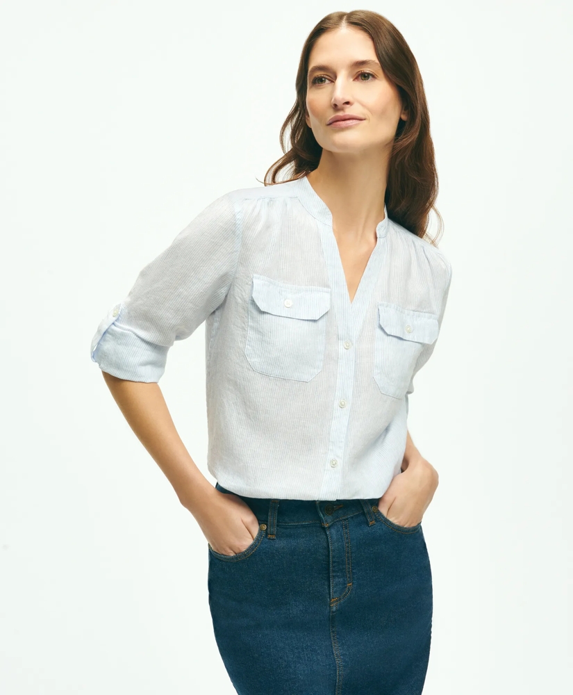 Utility shirts have a timeless appeal, and deserve a place in every wardrobe.Woven for us by the renowned Baird McNutt mill in Ireland, maker of the world's finest linen since 1912, this one features an updated open V-neck, genuine shell buttons and roll-tab sleeves.
