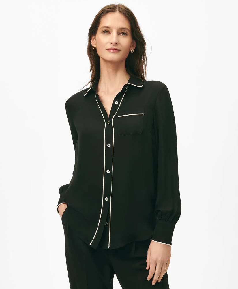 A drapey silhouette defines our must-have button-front shirt crafted in stunning silk georgette. Contrast piping at the collar, chest pocket, placket and cuffs adds a modern statement to your looks.