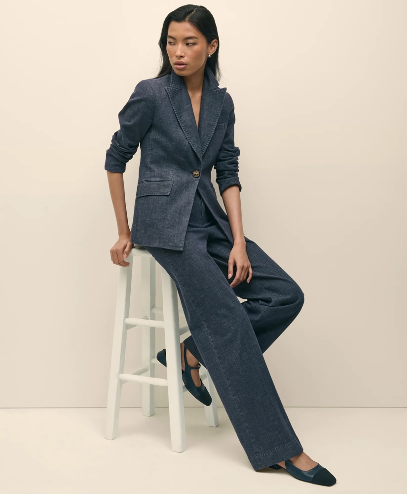 It's denim, elevated. A new take on this all-American fabric, ours offers a smooth, elegant approach. We finished it with classic pick stitching detail and authentic horn buttons. Pair with our matching trousers for a sophisticated full-denim moment.