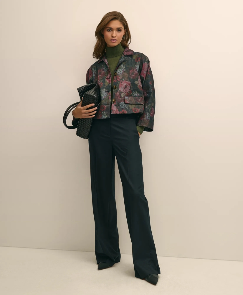 Our jacket is crafted from cotton twill woven with a subtle floral jacquard pattern, for a fresh perspective on classic outerwear. The modern silhouette paired with thoughtful details like dolman sleeves, an inverted back pleat, and genuine horn buttons delivers a chic and versatile piece for transitioning between seasons.