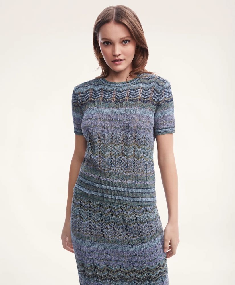 The perfect summer sweater features a versatile palette, ribbed neck, cuffs and hem and a zig-zag pattern that goes beautifully with the matching skirt.