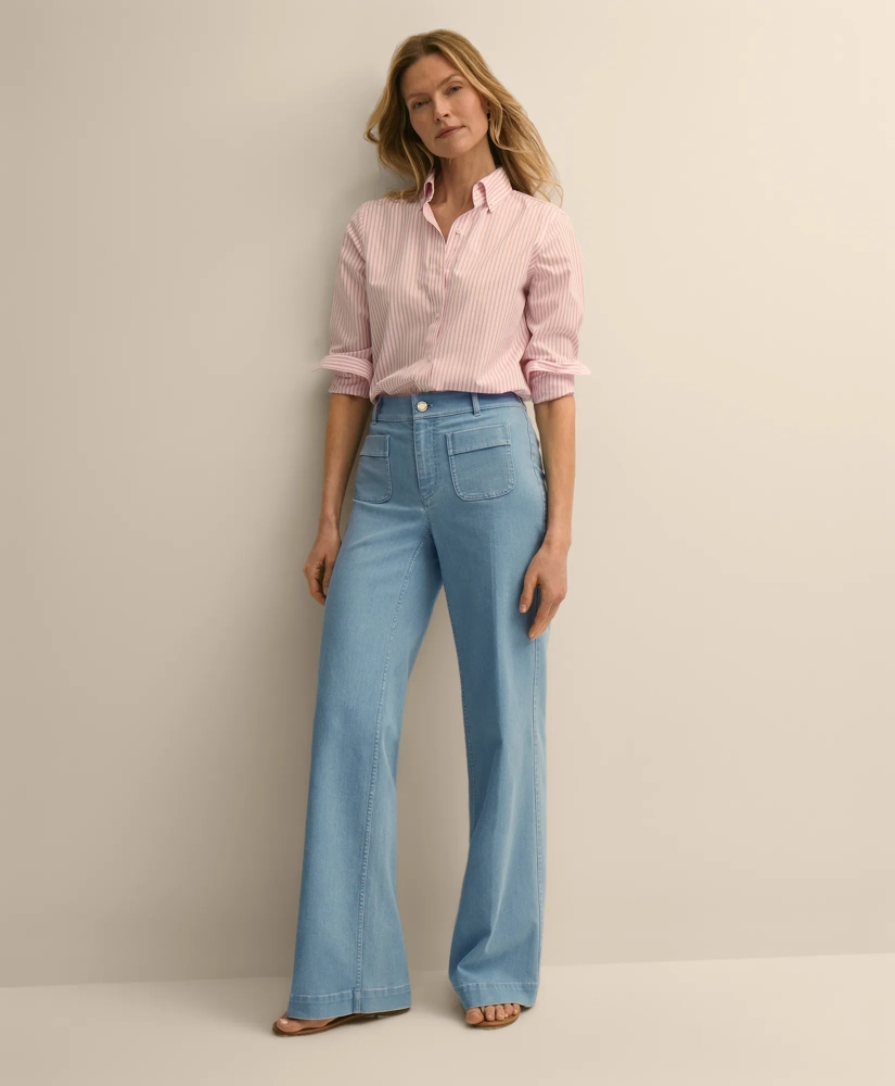 Our flare jeans offer vintage appeal for modern style. Done in a versatile light wash, we added flattering front pockets and just-right stretch for a perfect fit. Pair them with striped tees for coastal-inspired casual looks or classic twinsets for the office.