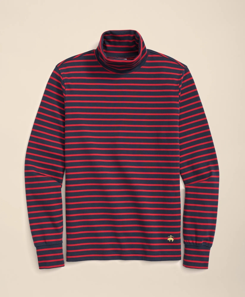In an elevated interlock knit fabric with soft cotton-blend threads and just-right stretch, this turtleneck looks just as good layered under a V-neck or cardigan as it does on its own.