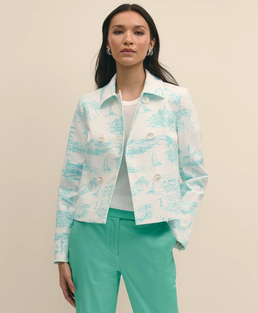 Our signature seasonal print adds a beautiful pop of color to your look with a turquoise toile motif inspired by Bermuda getaways. We adorned this go-to little jacket in a relaxed, double-breasted silhouette and finished it with shell buttons for a nod to luxe style. Pair with our matching pants for a coordinated look.