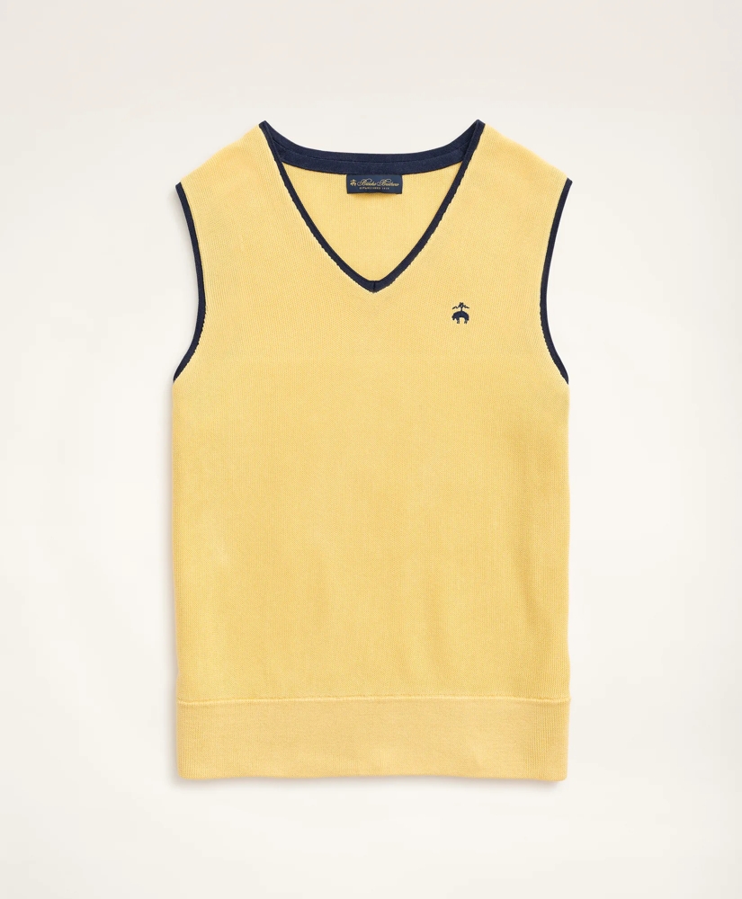 Beautiful garter-stitch texture, an embroidered chest logo and contrast trim at neck and armholes define our must-have layering vest for all seasons.