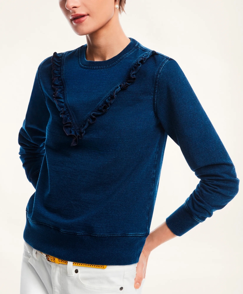 Our garment washed indigo sweatshirt is elevated with a feminine neck ruffle perfect for stylish comfort.